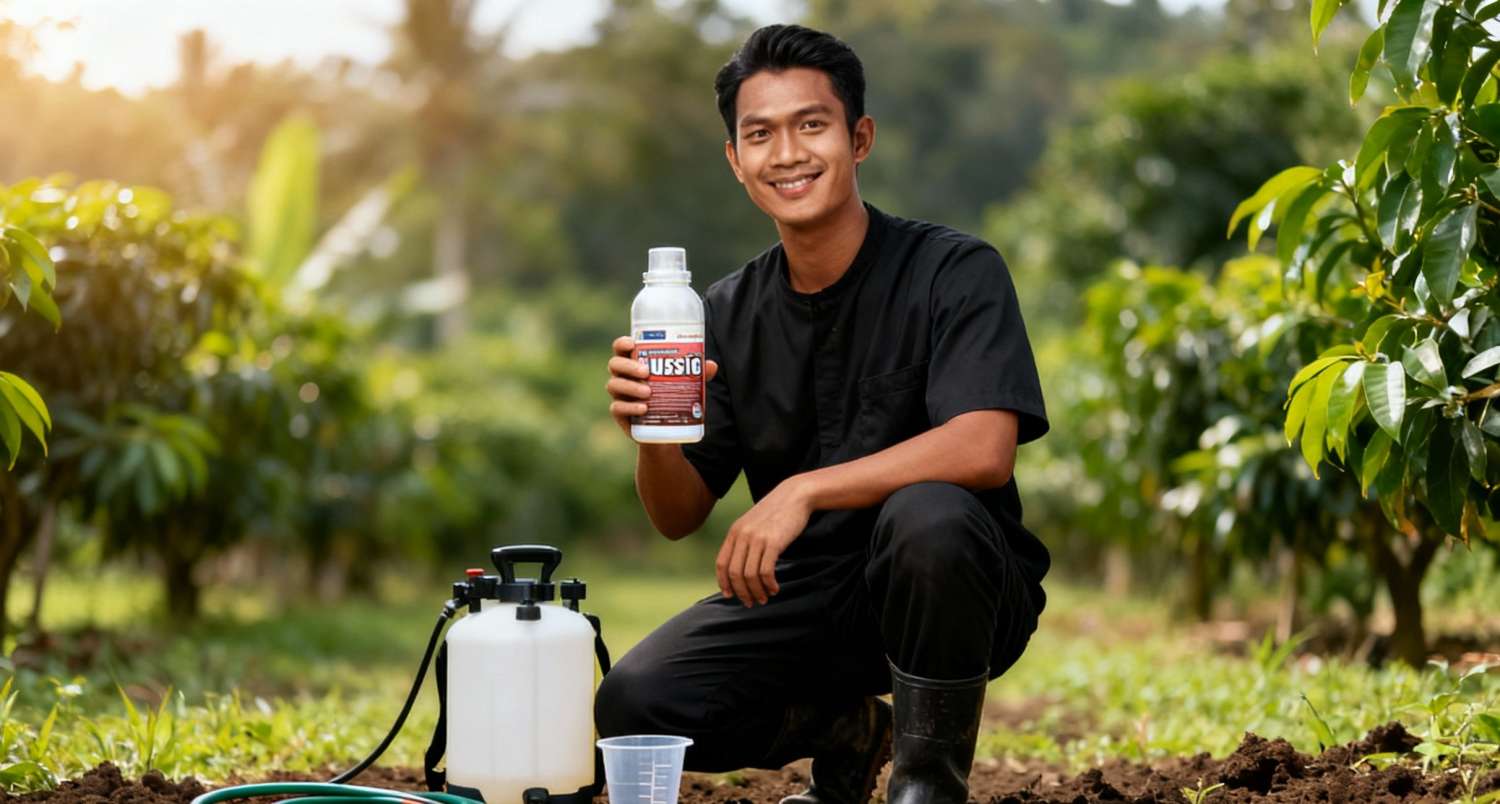 Aplikasikan dengan kocor langsung ke area perakaran dan pangkal batang.